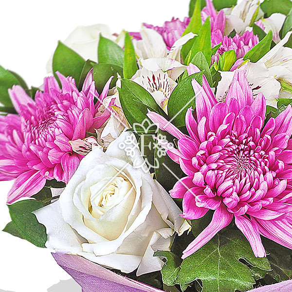 Главную роль в букете между собой разделили белые розы и сиреневые хризантемы, чудесно и живо дополняя друг друга в ласковых  объятиях великолепной эустомы.